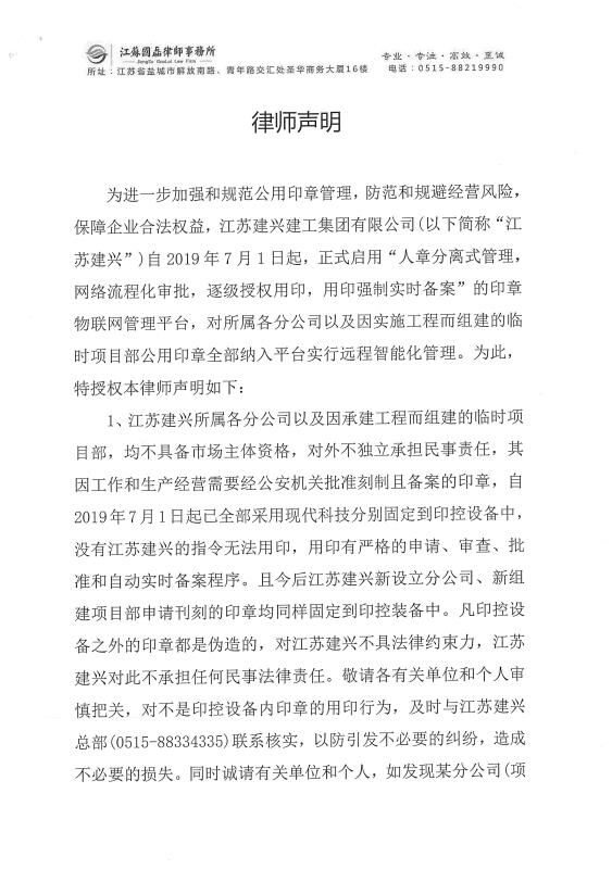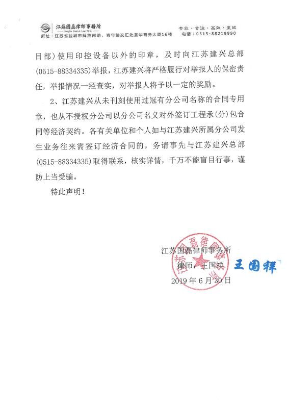 江蘇建興建工集團有限公司的法定代表人、董事長名為孫健強。不法分子劉書嶺冒充“江蘇建興建工集團有限公司”法定代表人、董事長職務,通過偽造我公司營業(yè)執(zhí)照、建筑工程承包資質證書和印章在北京、新疆、山西、山東等地進行合同詐騙等不法行為,已有相關單位和個人受騙上當,嚴重擾亂了我公司正常的經(jīng)營秩序,損害了我公司和其他建設單位與個人的合法權益。