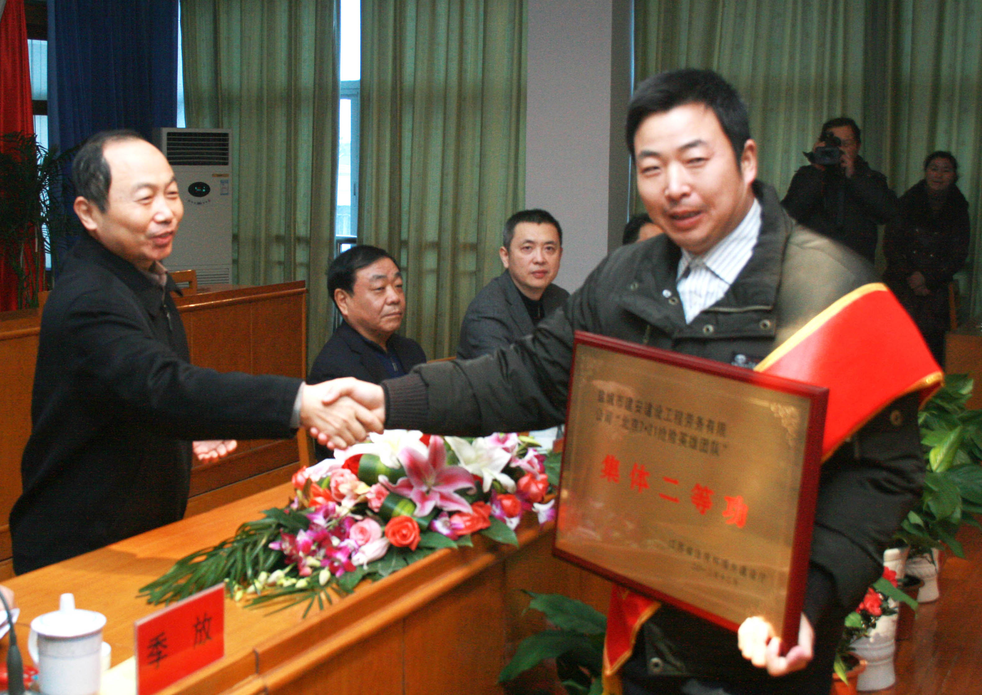 會(huì)議由市城鄉(xiāng)建設(shè)局季放副局長主持。會(huì)議開始前,省住建廳、市建設(shè)局領(lǐng)導(dǎo)及集團(tuán)公司孫健強(qiáng)董事長與“北京7.21英雄團(tuán)隊(duì)”6名代表合影留念。接著省住建廳人事教育處章小剛處長宣讀《江蘇省住房和城鄉(xiāng)建設(shè)廳關(guān)于給鹽城市建安建設(shè)工程勞務(wù)有限公司“北京7.21搶險(xiǎn)英雄團(tuán)隊(duì)”記集體二等功的表彰決定》,省住建廳機(jī)關(guān)黨委張寧寧書記給先進(jìn)集體代表頒發(fā)集體二等功獎(jiǎng)牌,杜金榮隊(duì)長代表英雄團(tuán)隊(duì)接獎(jiǎng)。